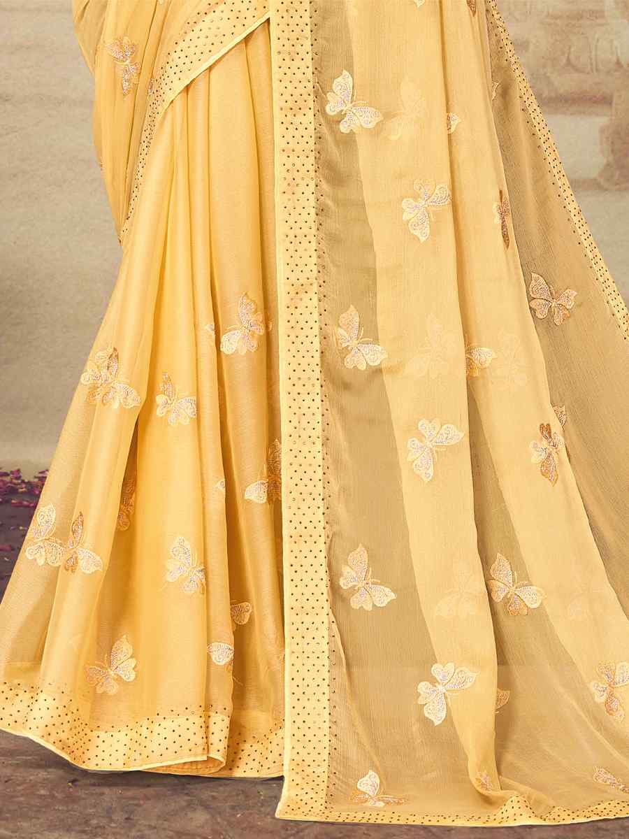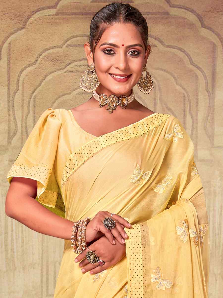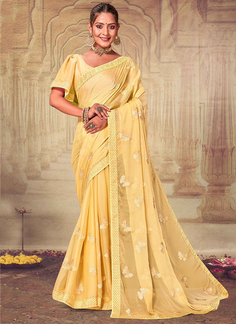 This Festival Wear Yellow Embroidery Work Chiffon Saree is accenting the charming feeling. The resham work appears to be chic and fantastic for any function.
